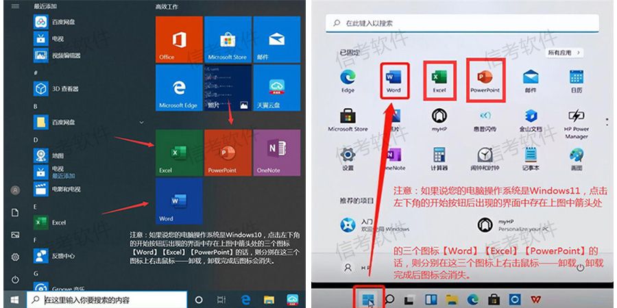 3、注意:如果說(shuō)您的電腦操作系統(tǒng)是Windows10/11,點(diǎn)擊左下角的開(kāi)始按鈕后出現(xiàn)的界面中存在上圖中箭頭處的三個(gè)圖標(biāo)【W(wǎng)ord】【Excel】【PowerPoint】的話,則分別在這三個(gè)圖標(biāo)上右擊鼠標(biāo)——卸載,卸載完成后圖標(biāo)會(huì)消失。