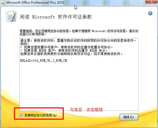 6、出現(xiàn)此界面,勾選“我接受此協(xié)議的條款”,然后點(diǎn)擊繼續(xù)。
