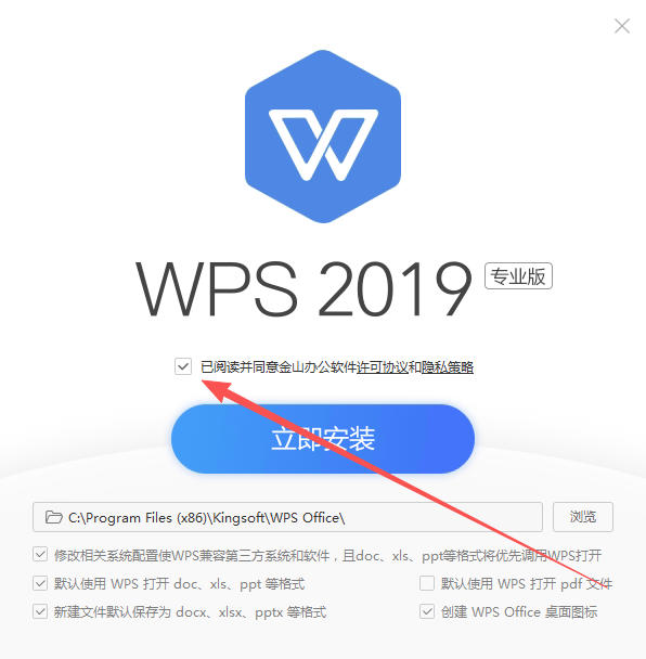 3、勾選已閱讀并同意金山辦公軟件許可協(xié)議和隱私策略。