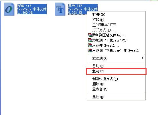 1、選中下載的字體文件,單擊鼠標(biāo)右鍵,選擇“復(fù)制”,