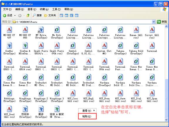 5、打開(kāi)“Fonts文件夾”,在空白處單擊鼠標(biāo)右鍵,選擇“粘帖”即可。