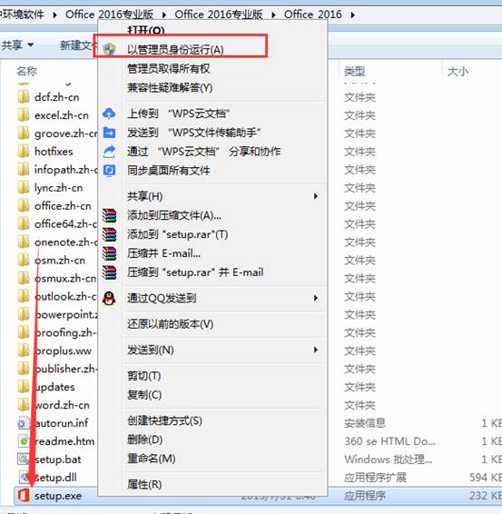 5、打開文件夾“Office2016(VOL版)”,找到里面的“setup.exe”,右擊—以管理員身份運(yùn)行。